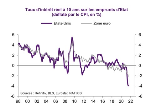 Not the interest rate alone (nominal), but the "real" interest rate, that is, the difference between the interest rate and inflation. When interest rates and inflation are close to zero, as has been the case in recent years, the two concepts overlap. But with the rise in prices that we have been witnessing for several months, the real interest rate has started to sink into negative territory (interest rate, still close to zero - inflation rate, which is starting to rise). According to Natixis, it stands at -4% in the United States and -2% in Europe.