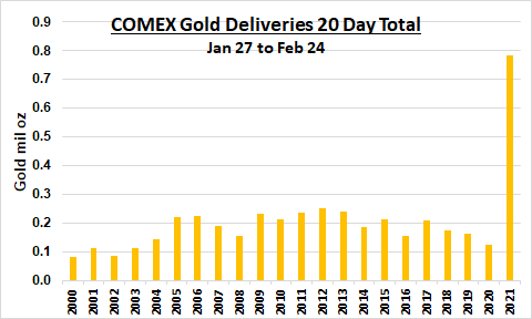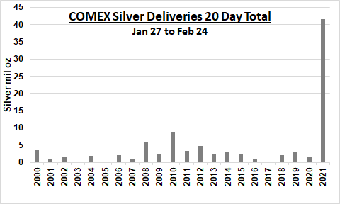 Delivery requests yesterday amounted to nearly 30 million ounces (910 tons), one of the five highest delivery figures since 2000. Over the last 20 years, this level of requests has increased to 42 million ounces (nearly 1,200 tons), five times the volume of the last Silver Rush (in 2010)!