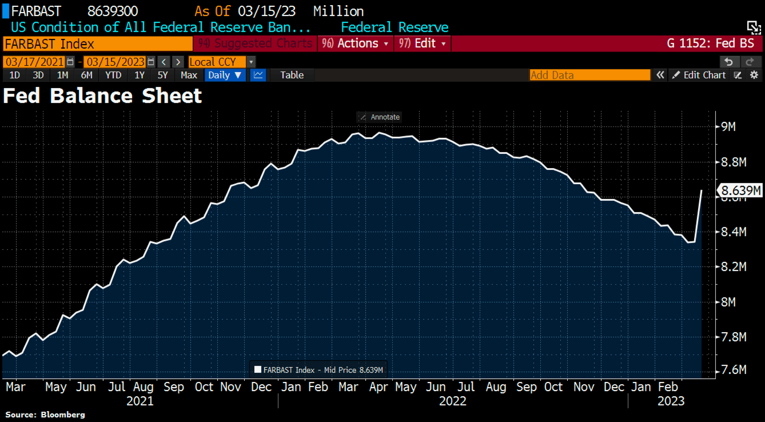In just a few days, the U.S. central bank has already injected nearly $300 billion into the U.S. financial system, an amount greater than that used during the 2007-2008 crisis. It has thus erased half of the effects of the reduction of its balance sheet (linked to its monetary tightening) that it started last June in order to fight inflation. This "pivoting" is the scenario we envisaged at the beginning of the year... inherent to the dilemma of the monetary institutions (they have not - yet - reduced their rates, as we will see later).