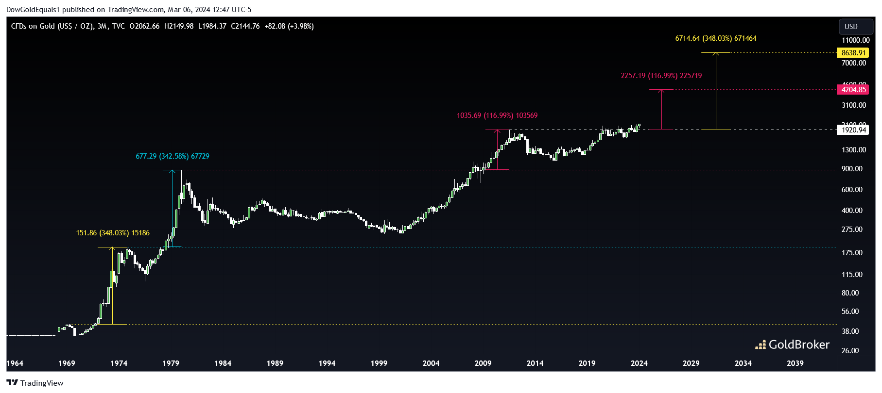 If we get a convincing quarterly close later this month above the old historic high of $1920, it will mark the second consecutive quarterly closing above that old high. This would provide compelling evidence that we can expect a 4th historic impulsive move higher from here. Based on historical precedent, it would not be unreasonable to expect Gold to rise to anywhere from $4,200 to $8,600!