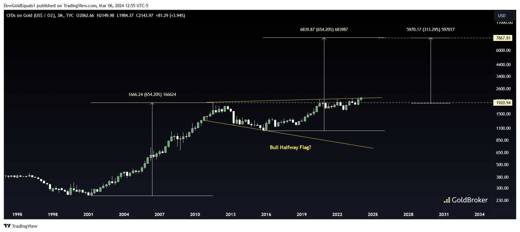 Looking at the technical picture, we can see if there is a set-up that might justify such a move higher. Indeed, there is! If we look at the recent move to an All Time High as a continuation of the secular bull market that began in 2001, we can see the downturn that began in 2011 as a possible Bull Halfway Flag consolidation that Gold is attempting to break out of. The measured move from a halfway flag would target around $7,800. When measured from the old historic high set in 2011, that would be a 311%. As we just saw, such a move falls well within historic precedent.