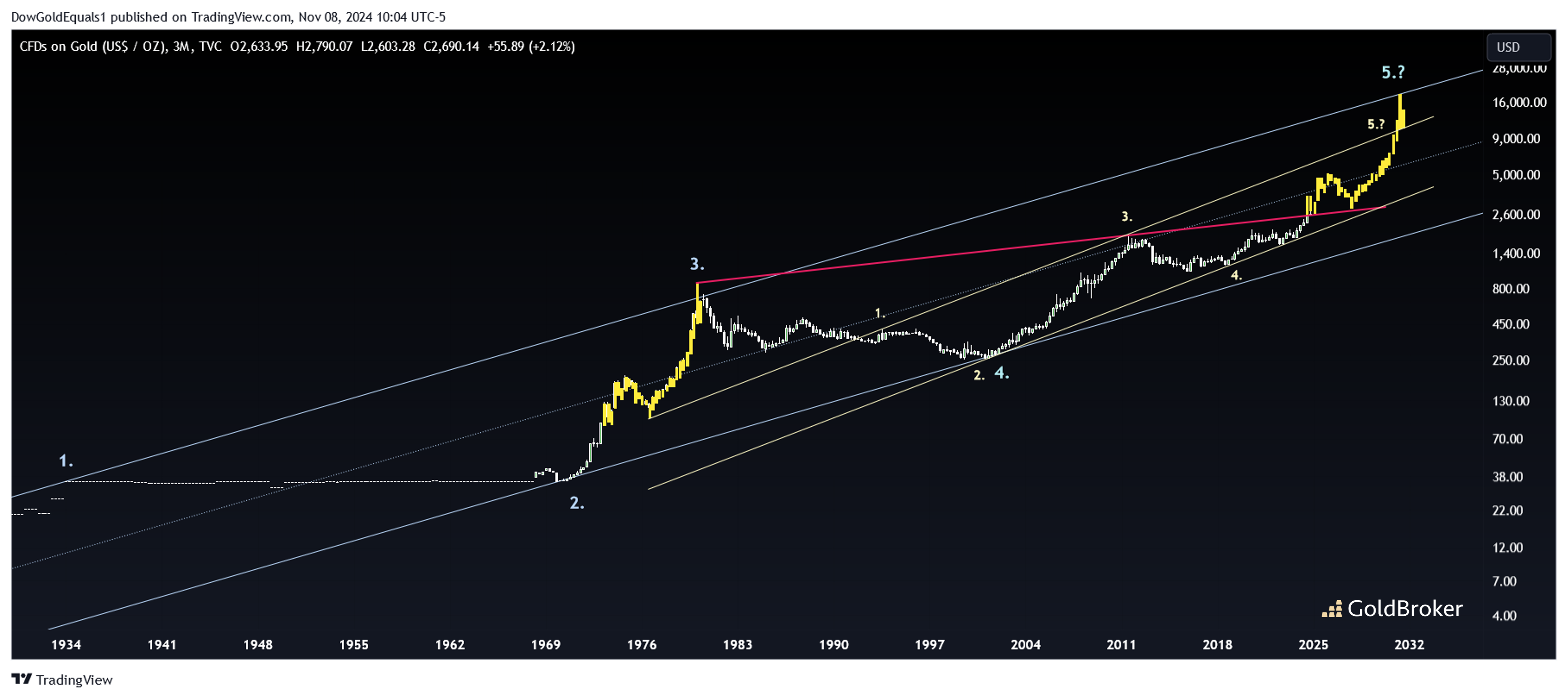 This week, we'll look at a couple of interesting long term charts of both gold and the dow to see how technical analysis suggests they MIGHT play out in the decades ahead. While there is a healthy dose of speculative analysis in both charts, my goal this week is to blend creativity and open-mindedness with the historical record of the price action to reveal possible long-term paths that won't surprise you should they unfold over the coming years.