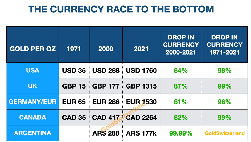 Precious metals principal role is wealth preservation or insurance against a rotten financial system and a constant debasement of currencies until they reach ZERO as the table below shows.