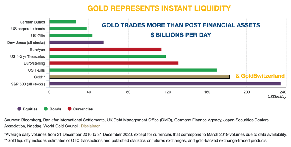 Over $180 billion of gold (mostly paper gold) is traded every day. Gold can be bought and sold around the clock at the quoted spot price plus a small margin for physical delivery.