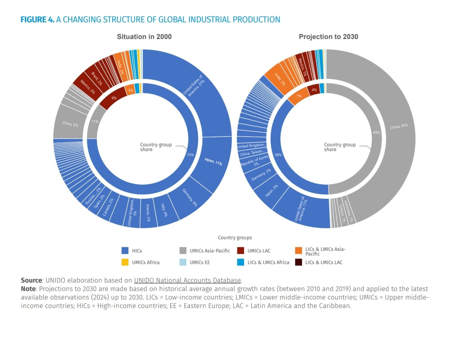This chart illustrates the profound change in the distribution of global industrial production between 2000 and 2030. In 2000, high-income countries (HICs) accounted for 75% of production, with leaders such as the USA (23%), Japan (11%) and Germany (6%). By 2030, the HICs' share is set to fall to 49%, with emerging countries, particularly China, taking a dominant role. China alone is expected to account for 45% of global industrial production, marking a historic economic shift.