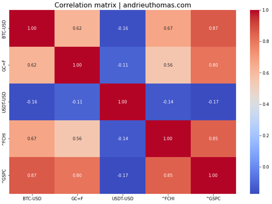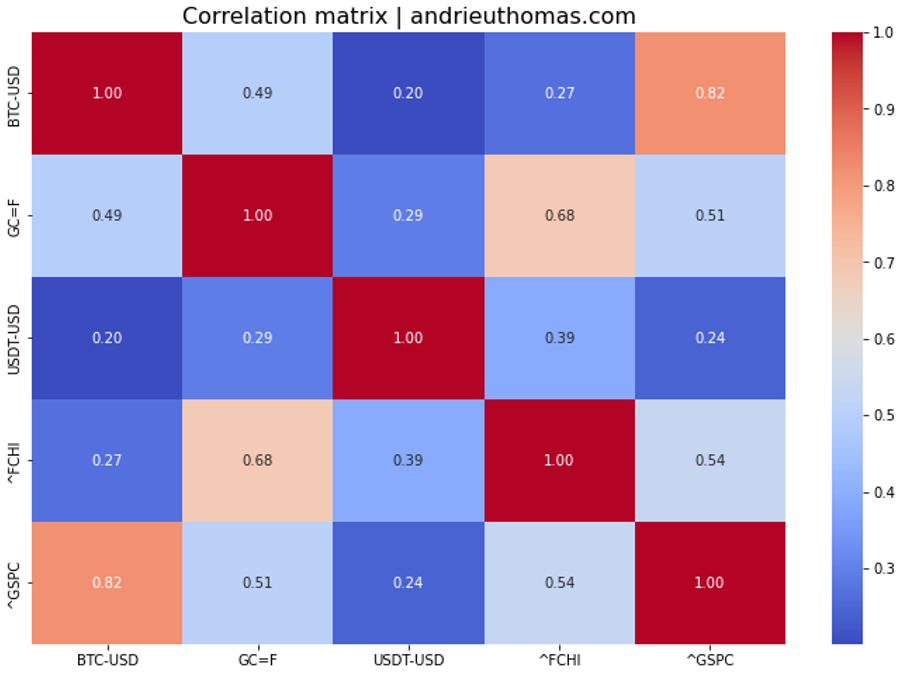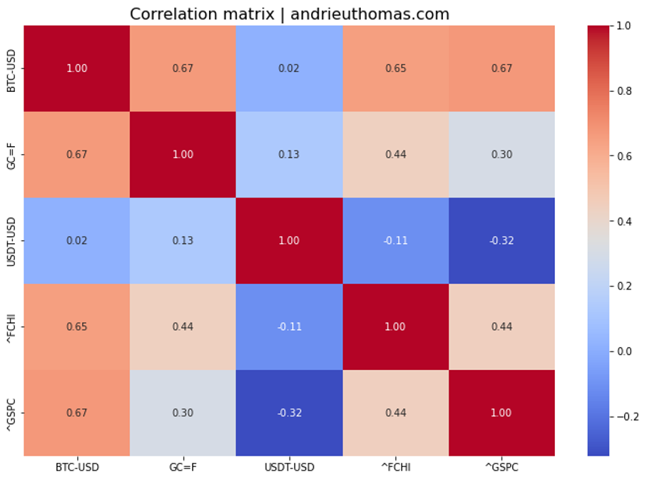 To begin our discussion, we have calculated the correlation matrix over the last five years (2018-2023) between the price of gold (GC=F), of the S&P 500 (GSPC), the CAC 40 (FCHI), the dollar (USDT) and bitcoin (BTC). A correlation coefficient close to -1 or +1 means that the two assets evolve symmetrically, while a coefficient whose value is close to 0 implies no link between the two assets. We're talking here about the price in dollars.