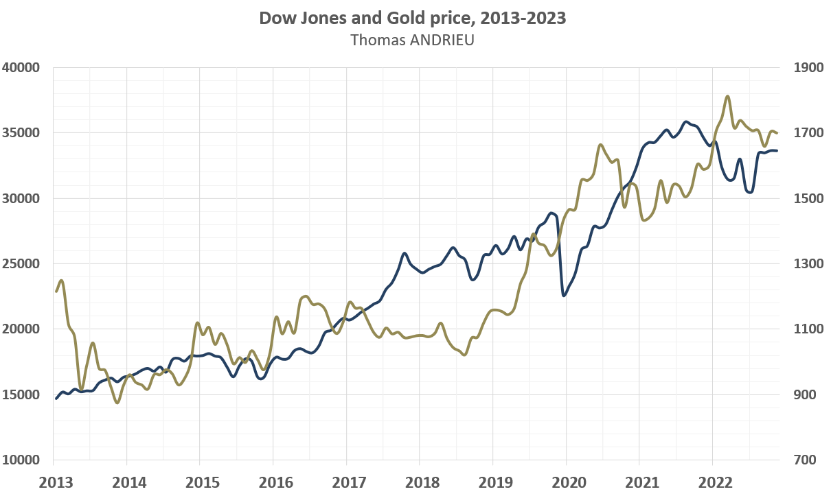 The supply of physical gold is a determining factor in the long-term behaviour of gold, since demand from "liquidity" can only be supplied at a certain minimum cost by the market. Under these conditions, it's worth considering the fact that the rise in gold’s production costs would be independent of that of the indices, and that despite this, the price of gold and the S&P 500 would be fairly symmetrical. Another explanation would be that the cost of production depends on major economic variables, such as inflation and interest rates, which are also determining variables for the S&P 500. In any case, available liquidity does seem to influence the price of gold during bull markets. It should be noted that this phenomenon of long-term asset correlation is generally common to all markets, since it is the major economic variables that act on all markets.