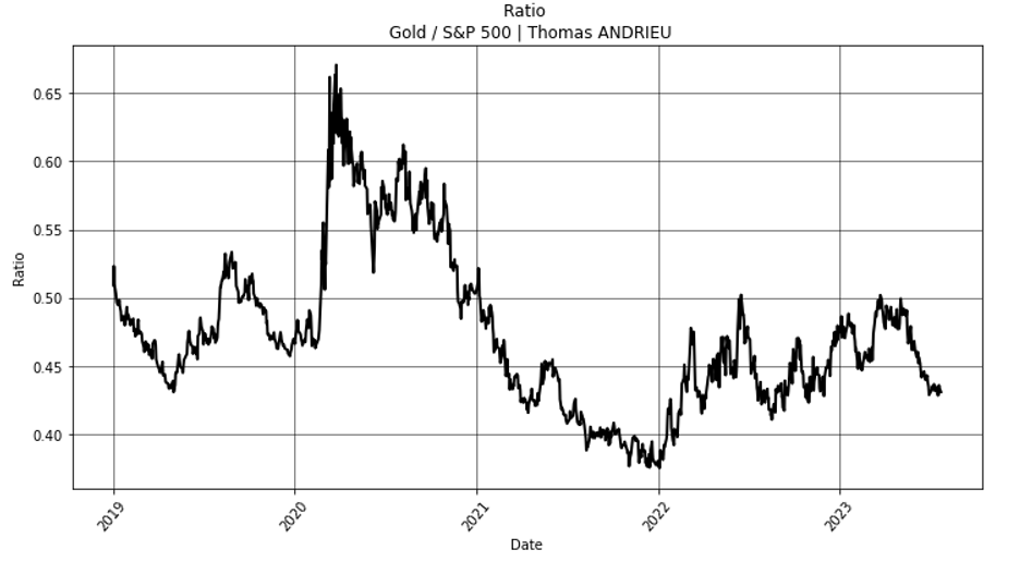 We have shown that gold and the S&P 500 show a certain symmetry. To better compare the evolution of the two assets, we have calculated the ratio between the price of gold and the price of the S&P 500. Since 2019, the periods in which gold outperformed the S&P 500 were March 2019-March 2020, then January 2022 to mid-2023. Conversely, 2020 and 2021 were more favorable for the S&P 500. Moreover, the gold/S&P 500 ratio has been channelled between 0.4 and 0.5 since 2021. The presence of a channelled ratio tends to support the correlation between the two assets. However, we can clearly see that the value of gold can vary considerably from month to month.