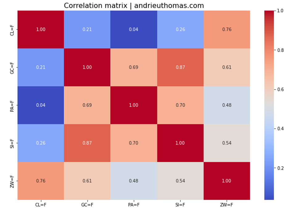 To conclude this paper, we turn to the link between the gold price and other commodities. Between 2018 and 2023, we have selected five commodities. The study includes silver (SI=F), wheat (ZW=F), palladium (PA=F) and oil (CL=F). As a result, we show that gold prices are +87% correlated with silver prices, +61% with wheat prices, +69% with palladium prices, and +21% with oil prices.