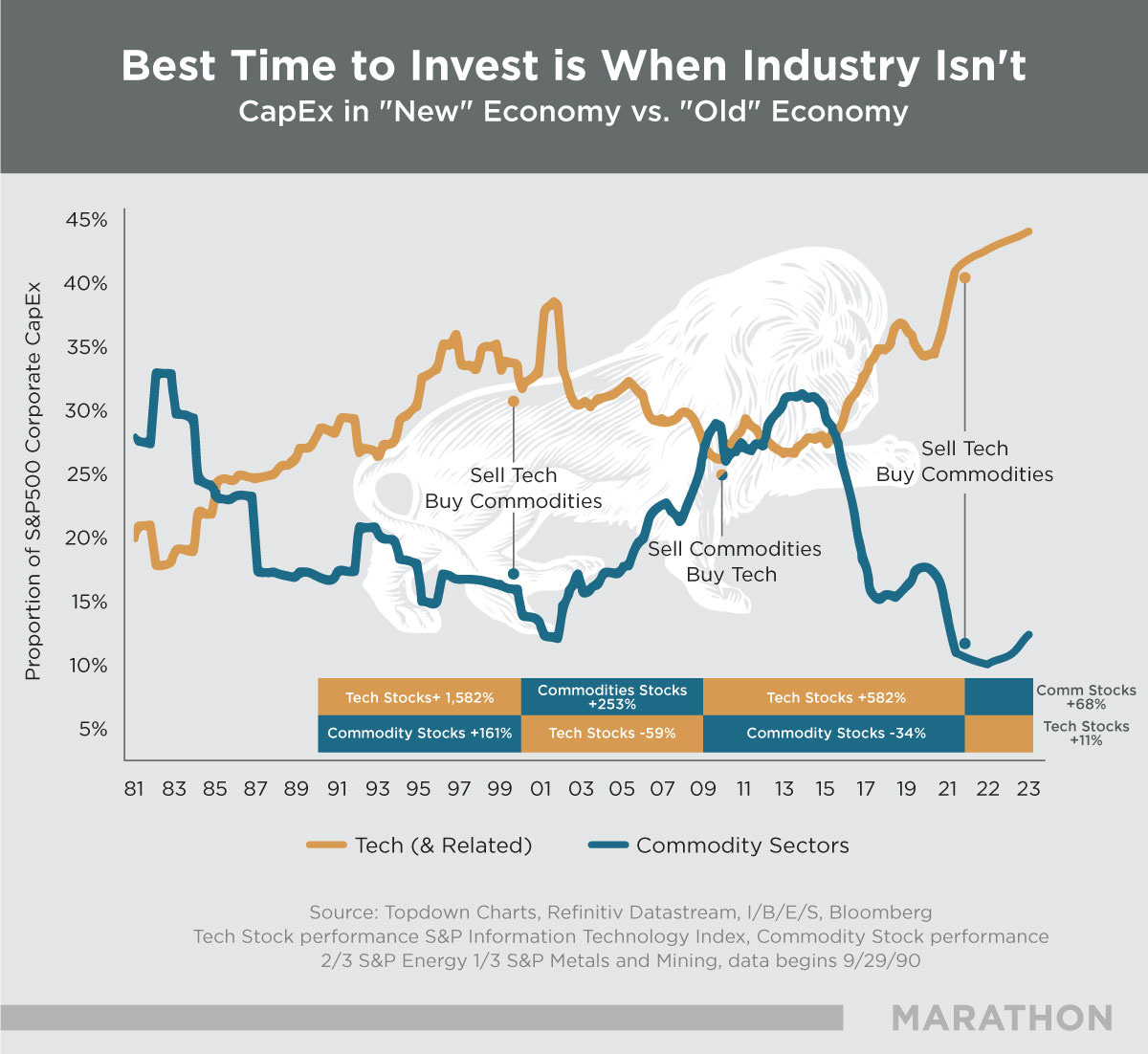 San Francisco-based Marathon has just published a very telling chart on the cycle shift underway: since 2022, the new economy has been underperforming the old economy. Technology stocks have continued to grow, but at a much slower pace than in the previous cycle 2011-2022.