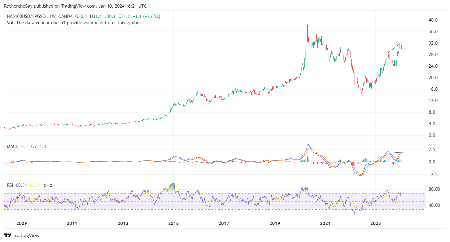 Let's take a look at the NAS100/SPGSCI chart, which measures the performance of US technology stocks against a basket of commodity-linked stocks: