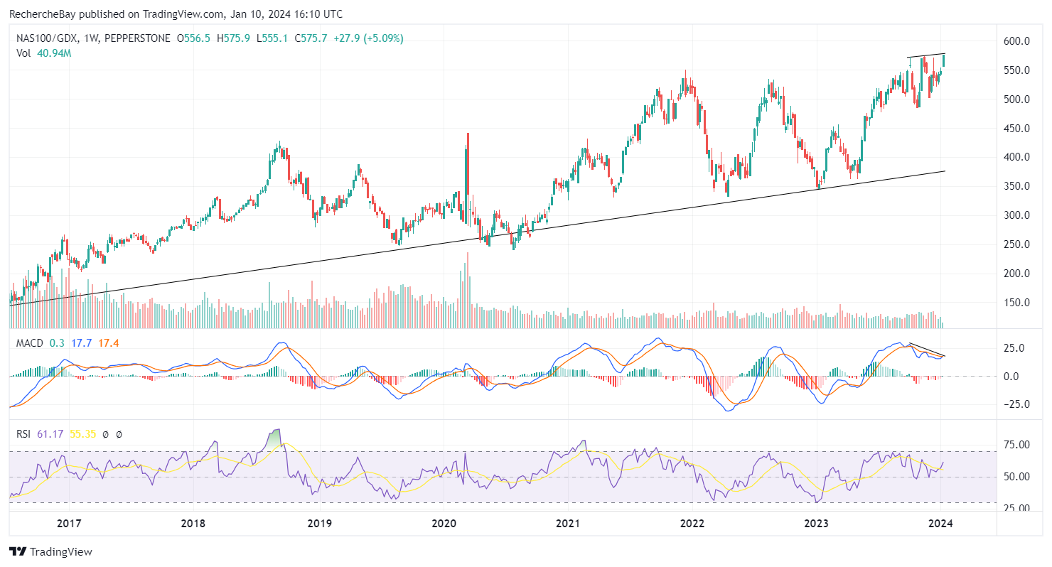 Looking at the NAS100/GDX chart, which compares technology stocks to mining stocks in weekly variation, we also see a bearish divergence at the last peak: