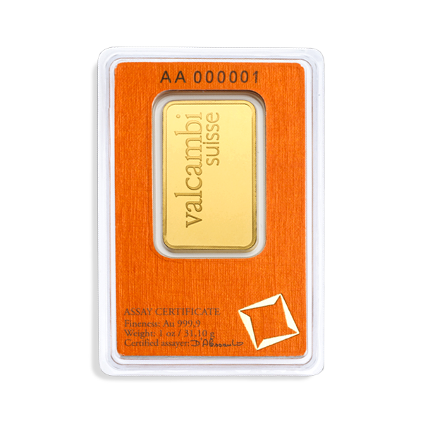 In addition to the Valcambi logo, the bar's specifications, such as its weight "1 oz", metallic composition "fine gold", purity "999,9", assayer's mark and a unique serial number are meticulously inscribed on the obverse. The reverse bears only the inscription "Valcambi Suisse".