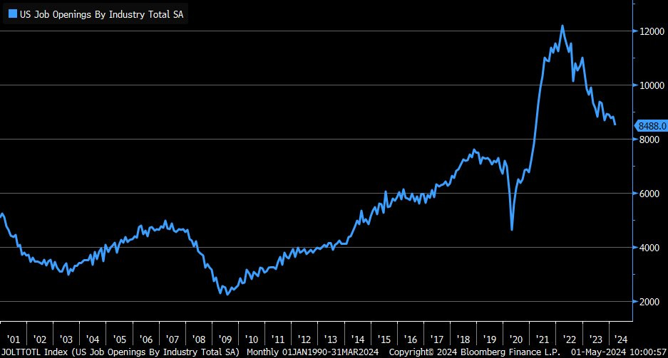 The job market is clearly cooling. March JOLTS job vacancies fell to 8.488 million, compared with 8.69 million expected and 8.813 million the previous month, the lowest level since the post-pandemic recovery: