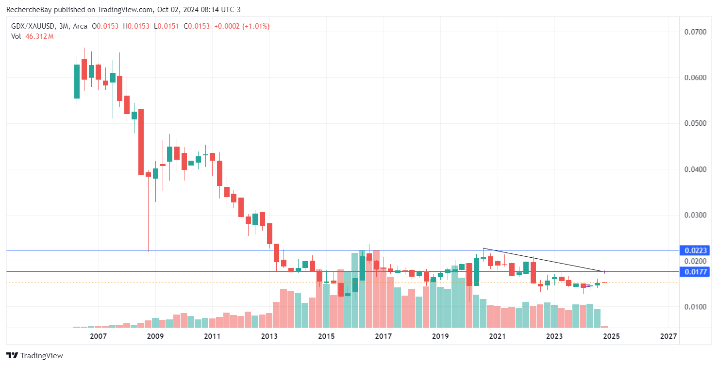 This raid would come at a time when miners have never been so cheap relative to gold. The GDX/gold quarterly chart is still stuck at its lows: