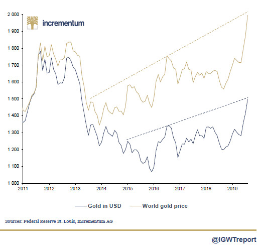 First of all, in euros, the gold price on August 25 and 26, 2019 surpassed its historic high of October 4, 2012, exceeding the 1,380.92 € mark. As I write these lines, the price per ounce is now 1324 €.