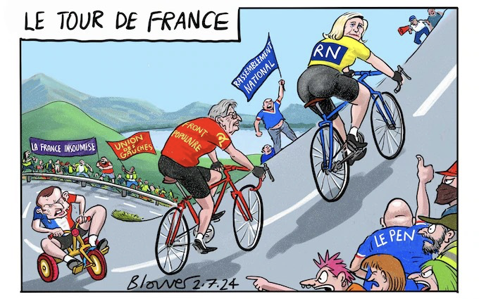 So, the order in the caricature below from the first week has now reversed although Le Pen’s National Rally is the biggest party.