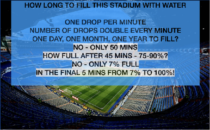 It takes 50 minutes to fill a stadium with water, starting with one drop and doubling every minute – 1, 2, 4, 8 drops etc. After 45 minutes the stadium is only 7% full and the last 5 minutes it goes form 7% to 100%.
