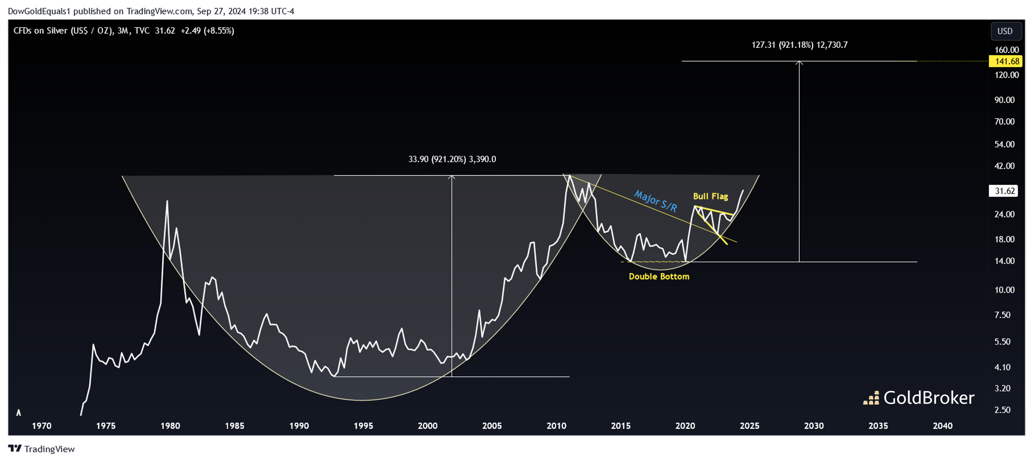Taking a broader view, I remind you that the current move in silver appears to be an attempt to complete a handle on a C&H pattern that dates back to the 1980 high with a measured move on a quarterly close around $140. Silver's future over the coming years looks incredibly bright.