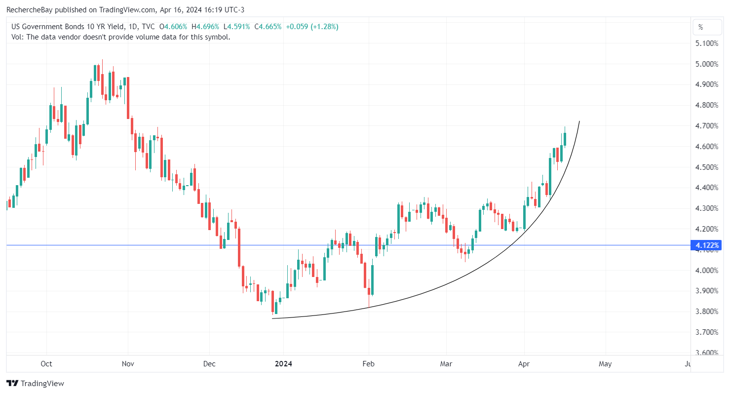 The rise of the US 10-year is even following a parabolic trend since the start of the year, on its way to its October 2023 peaks: